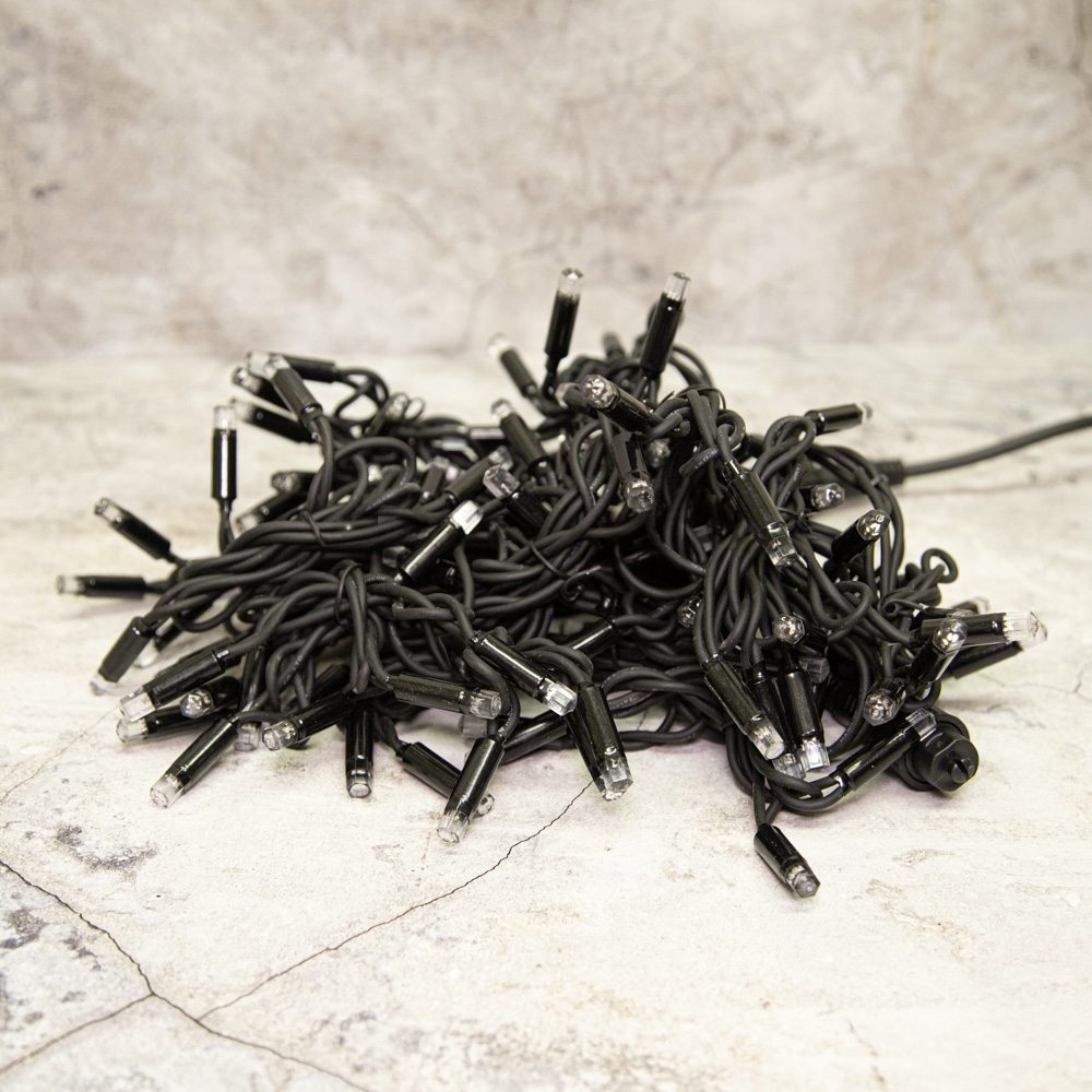 Гирлянда работает от стандартной сети 220 В и сразу готова к монтажу — в комплекте есть подключение. Защита IP65 обеспечивает надёжную работу на улице: снег, дождь, ветер — не помеха. Чёрный каучуковый провод 3.3 мм остаётся гибким даже в мороз, не трескается и не ломается.
