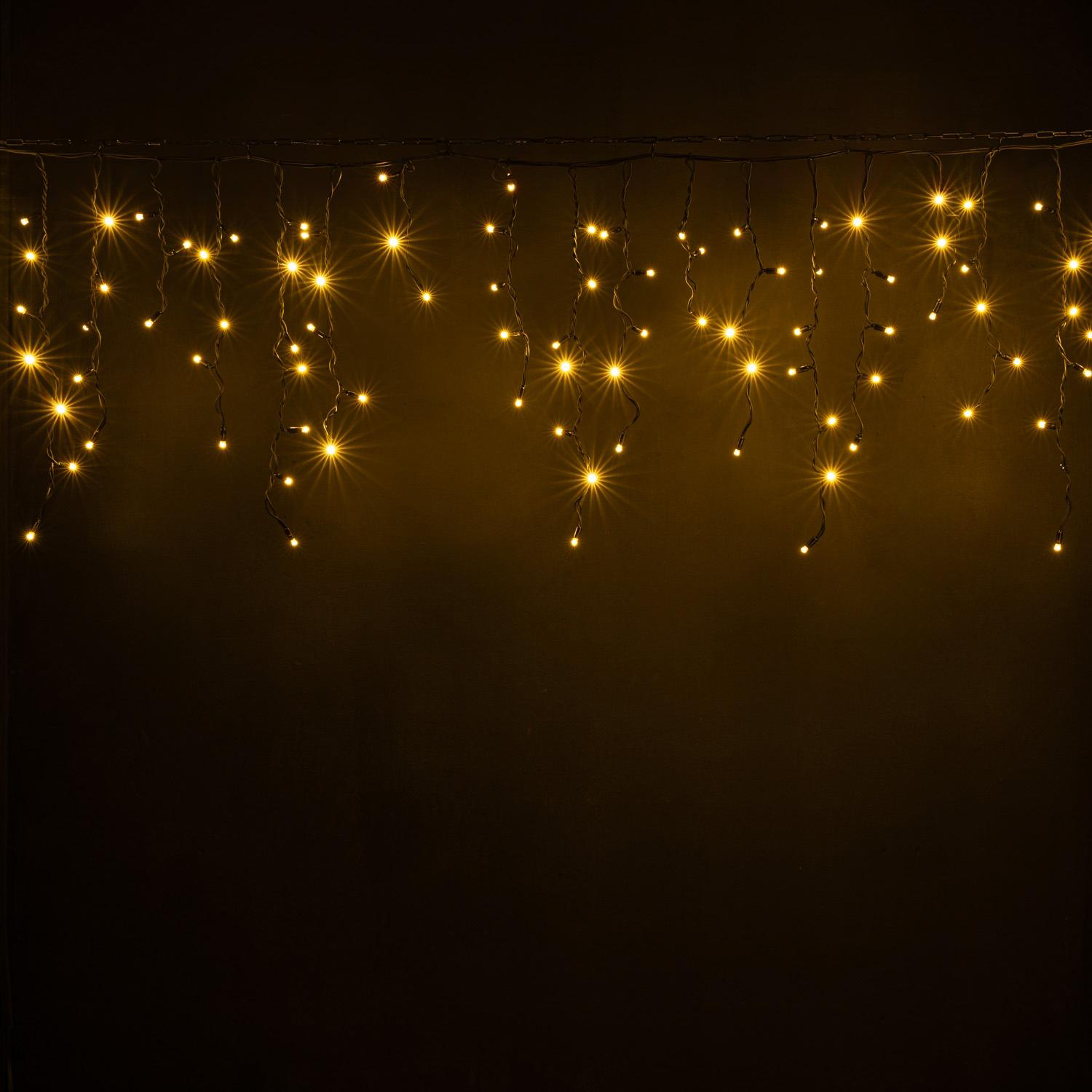 Уличная гирлянда бахрома 5 м с тёплым белым свечением. 260 LED-диодов, статичный режим. Провод — чёрный каучук 3.3 мм. Защита IP65. Соединяется до 10 штук. Идеально для фасадов, деревьев и заборов.