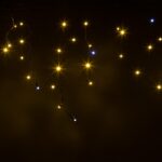 150 светодиодов равномерно размещены на 5-метровой основе. Лучи длиной от 30 до 70 см создают плотный каскад — визуальный «световой водопад», подчёркивающий геометрию здания. Это решение даёт достаточную яркость при низком энергопотреблении (примерно 18–20 Вт на всю гирлянду).
