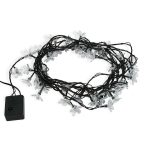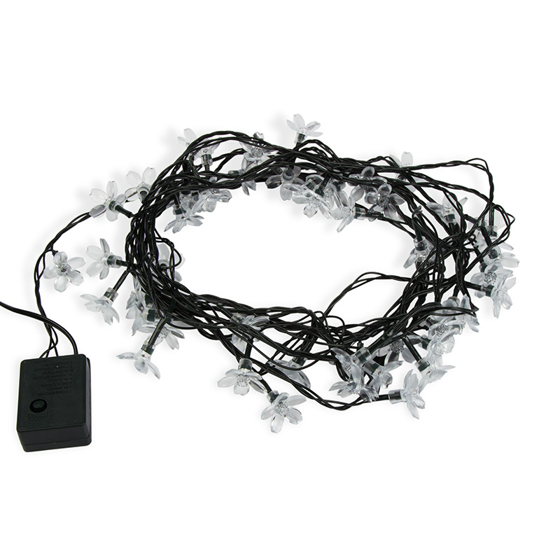 Тёмно-зелёный провод делает гирлянду удобной для размещения на ёлке: провод сливается с ветками, а цветы создают иллюзию того, что свет исходит из самой композиции. В интерьерных зонах он тоже практически незаметен, поэтому визуальный акцент остаётся на цветках.