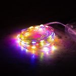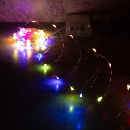 Тонкая гирлянда с эффектом «росы» — 100 ярких мультицветных диодов на серебристом проводе. Постоянное свечение, питание от батареек, длина 10 метров. Идеальна для оформления интерьера, ёлок, фотозон и декора.