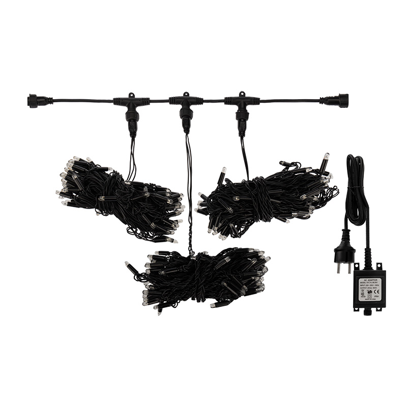 Главная особенность конструкции — это возможность быстро разворачивать и собирать подсветку без лишних соединений. Три параллельные нити равномерно распределяют нагрузку, а гибкий провод из чёрного ПВХ остаётся прочным даже при низких температурах. Светодиоды расположены с оптимальным шагом, что обеспечивает плотное и равномерное свечение без «провалов» по яркости.