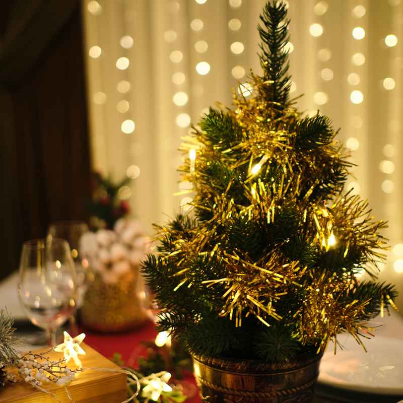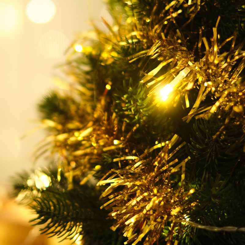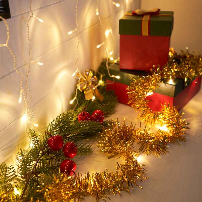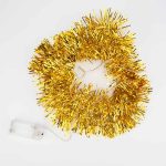 Главная особенность этой модели — золотистая мишура, которая играет роль миниатюрного отражателя. Она усиливает свечение, делает его более тёплым и объёмным. Это особенно заметно при приглушенном свете комнаты: гирлянда выглядит как небольшой световой поток, который оживляет интерьер и создаёт праздничное настроение.