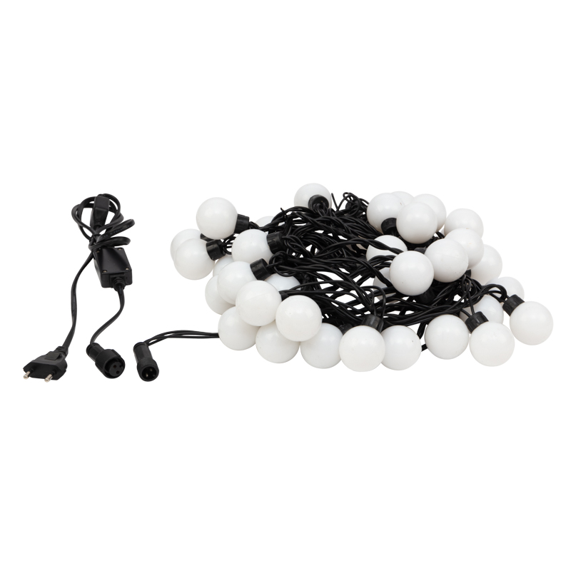 Вместо привычных лампочек — шарики диаметром почти 4 см. Они создают мягкое, рассеянное свечение и хорошо видны даже с расстояния. Такая гирлянда не теряется в пространстве, а становится полноценным декоративным элементом.