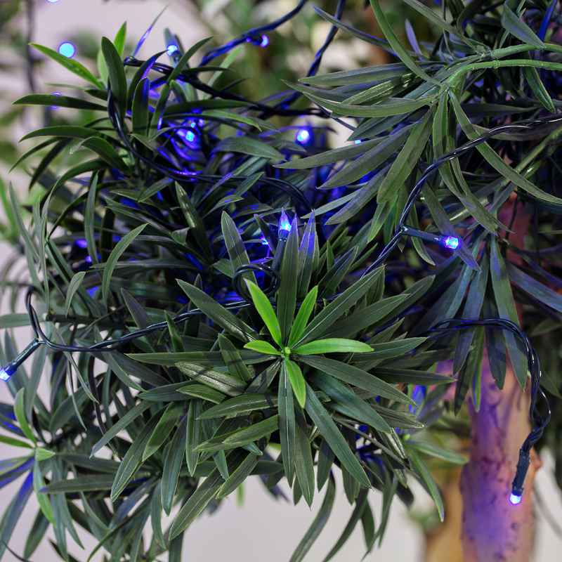 Эта гирлянда — про стиль, холодную красоту и новогоднюю эстетику. Глубокий синий цвет свечения подчёркивает интерьер, делает ёлку нарядной, а окно или стену — выразительными. Динамика делает картинку живой: огни переливаются, мигают, пульсируют — как в фильмах про Рождество.