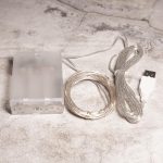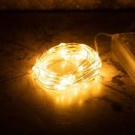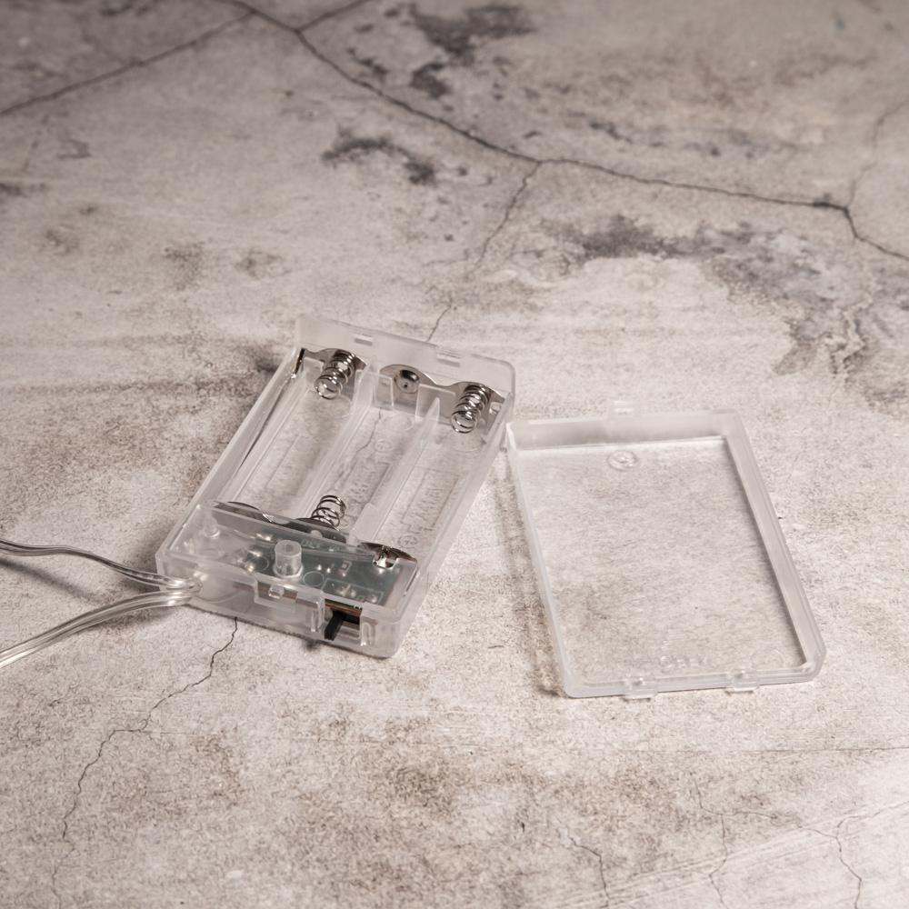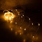 Маленькие светящиеся точки равномерно распределены по всей длине провода. Визуально создаётся ощущение, будто капли света зависли в воздухе — особенно красиво на фоне стекла или зеркала.