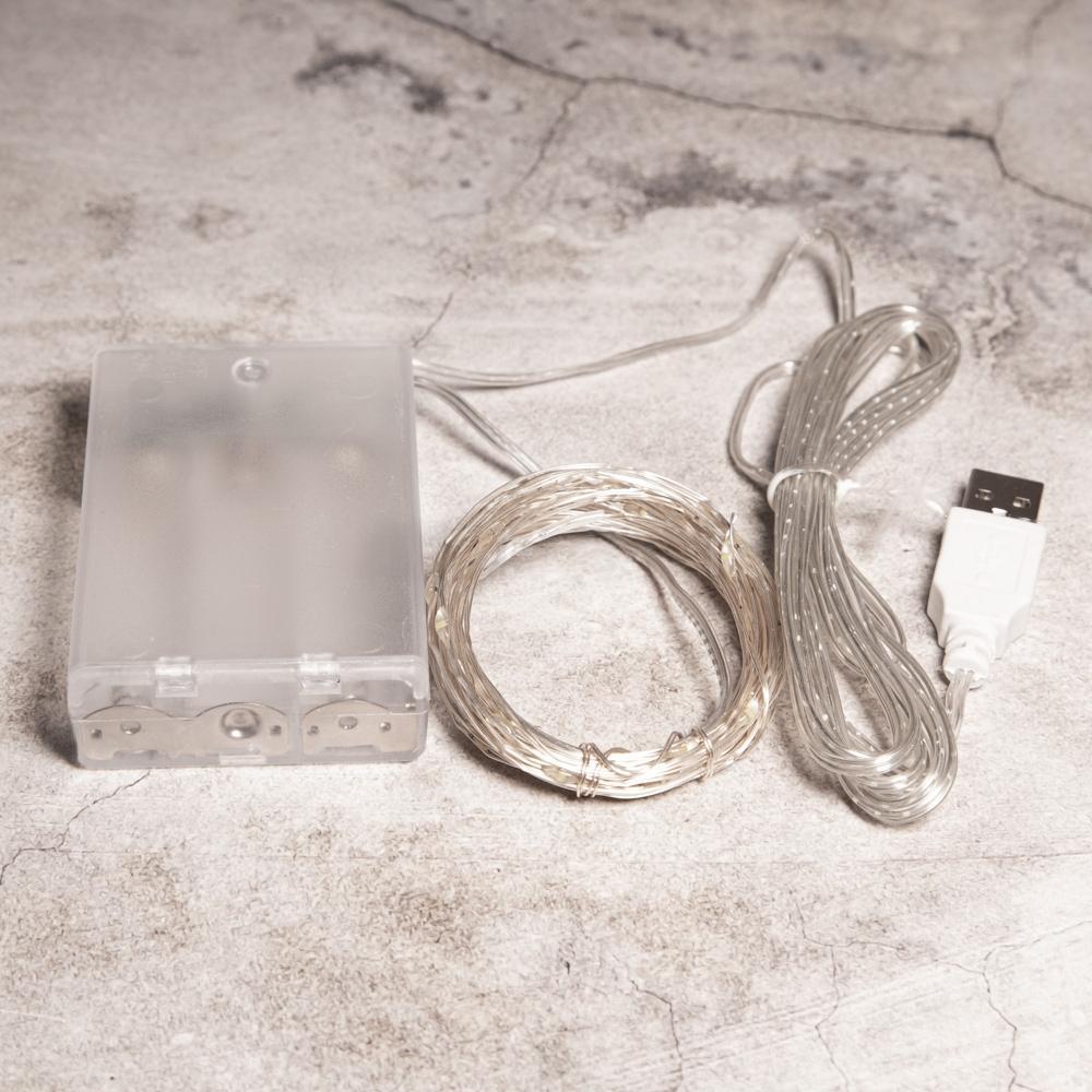 Тонкая гирлянда с эффектом росы. Тепло-белый свет, 100 светодиодов на 10 м. Провод — серебристый, почти невидимый в интерьере. Подходит для оформления интерьера, фотозон, декора в домах и кафе.
