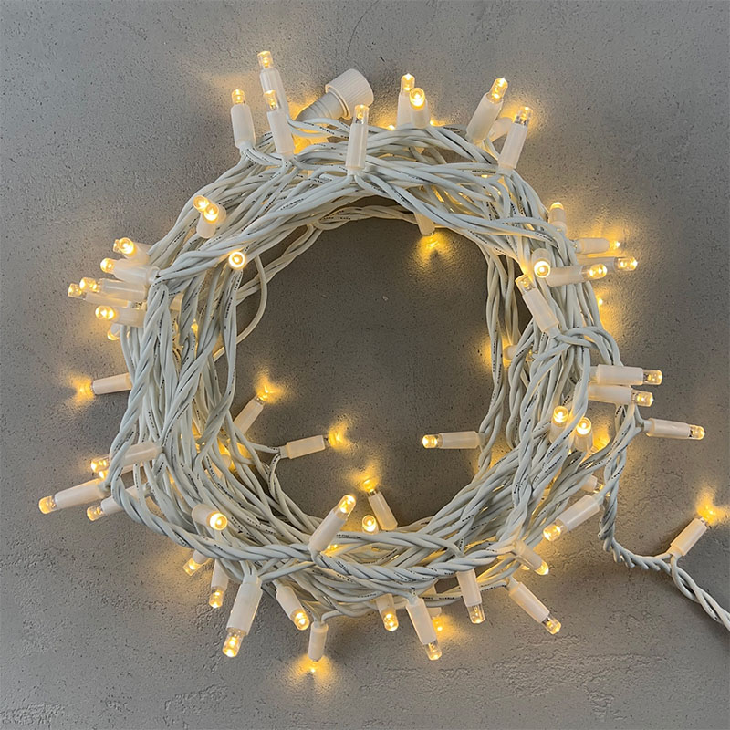 Надёжная гирлянда длиной 10 метров с тёплым белым свечением, 100 светодиодов, питание 24 В, прочный белый каучуковый провод 3 мм. Подходит для улицы и круглогодичного использования. Идеальна для деревьев, перил, колонн и фасадов. Повышенная влагозащита IP65 и мягкое статичное свечение — безопасно, эстетично, долговечно.