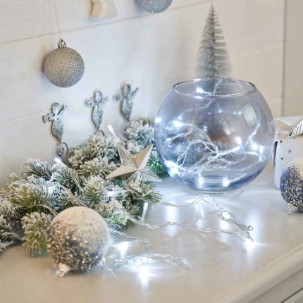Тонкий прозрачный ПВХ-провод универсален: он незаметен на светлых поверхностях, в стеклянных и акриловых декорациях, а также в снежных интерьерных зонах. Такое исполнение помогает создать ощущение лёгкости и воздушности, а гирлянда выглядит аккуратно даже при дневном свете.