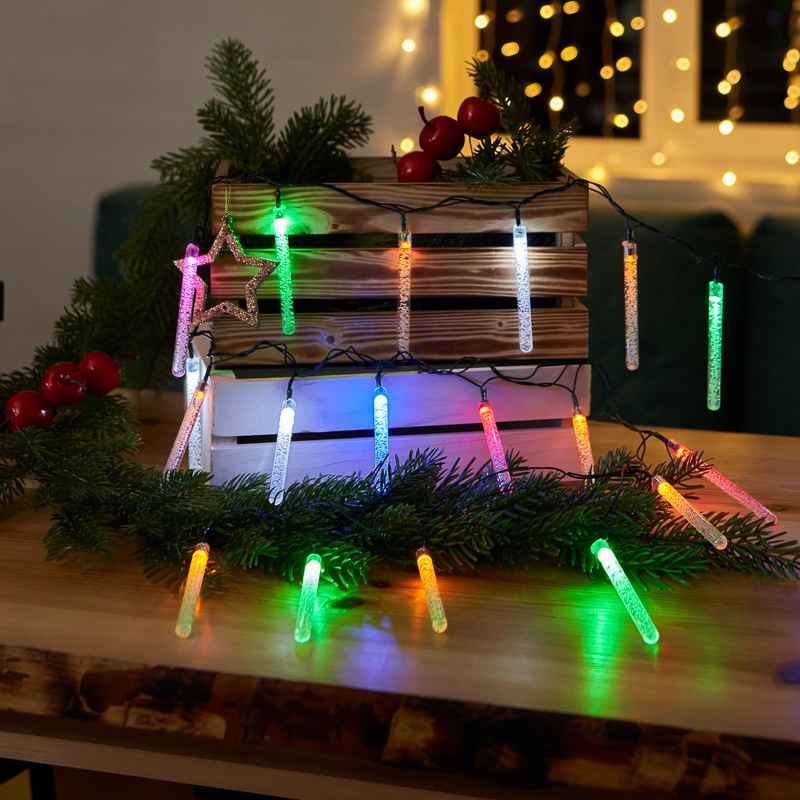 Гирлянда «Палочки» 2 м — необычное декоративное решение с мультиколорным динамическим свечением. Продолговатые насадки создают выразительные световые акценты, а тёмно-зелёный провод сливается с ветками ёлки и интерьерными элементами. Гирлянда подходит для праздничного оформления комнат, ёлок, полок, стен и небольших декоративных композиций внутри помещений.