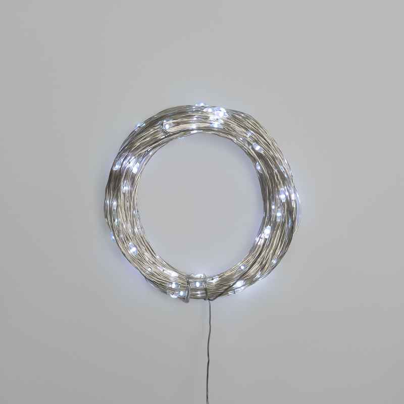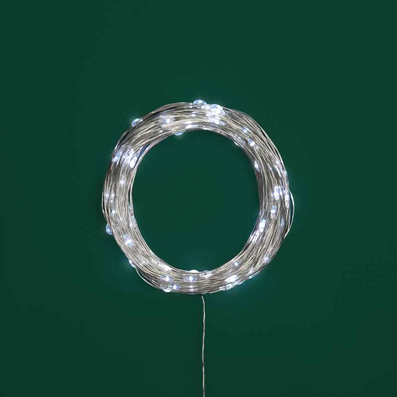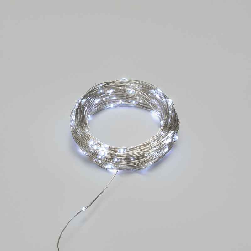 Тонкая гирлянда «Роса» длиной 20 м с белым свечением. Постоянный свет, металлический серебристый провод, степень защиты IP44. Подходит для уличного и интерьерного декора — деревья, заборы, перила, арки. Готова к использованию: есть питание и 3 м шнура.