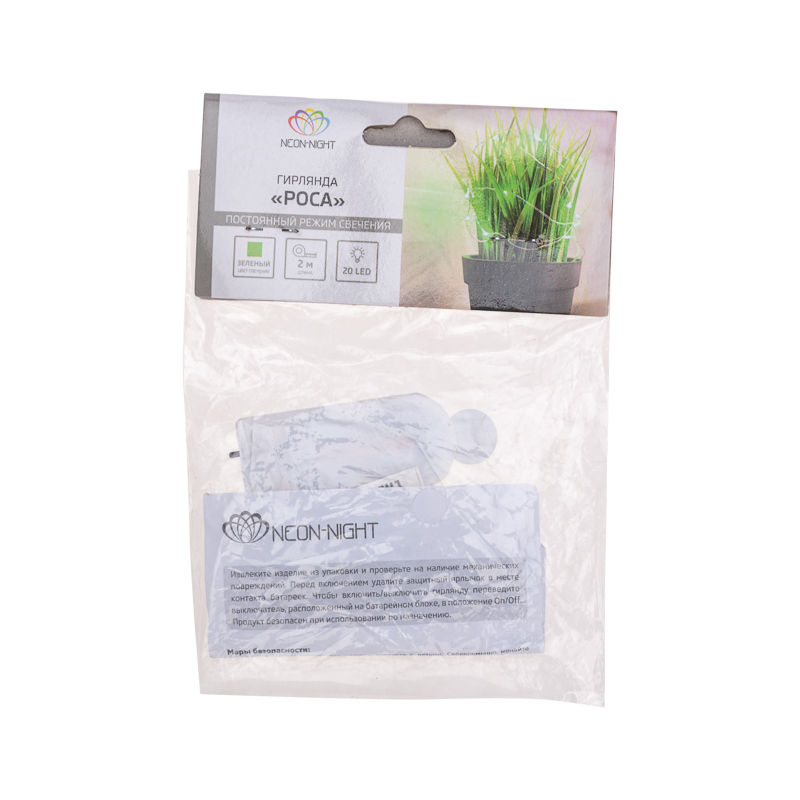 Гирлянда «Роса» длиной 2 метра с 20 зелёными светодиодами создаёт атмосферу свежести и уюта. Гибкий серебристый провод позволяет легко формировать композиции, а питание от батареек обеспечивает полную свободу размещения без привязки к розетке.