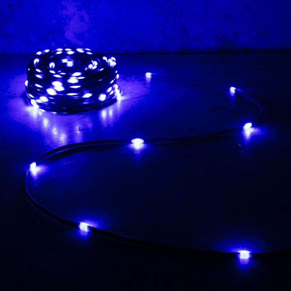 Гирлянда длиной 30 метров с синим свечением и эффектом капель росы. Мерцание Flash, 8 режимов, питание 24 В. Зелёный провод незаметен в хвойном декоре. Подходит для украшения интерьера, ёлок, витрин и фотозон.