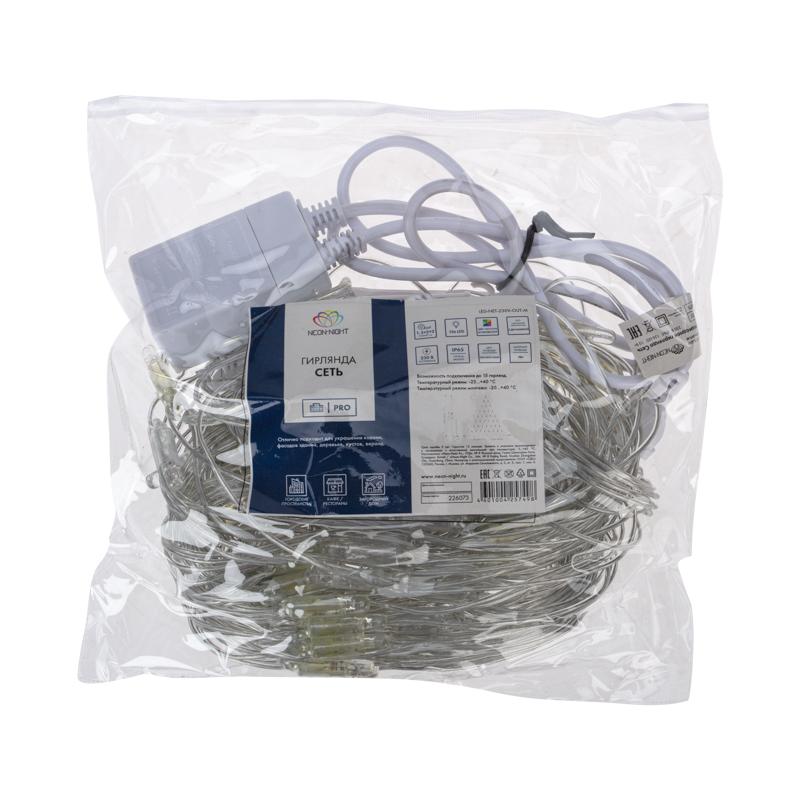 Светодиодная гирлянда-сетка 1,5×2×2 м с динамичным свечением и 136 яркими диодами. Прозрачный ПВХ-провод, защита IP65, подключение на 230 В. Подходит для улиц, фасадов, заборов и деревьев. Встроенный контроллер, 8 режимов, соединение до 15 гирлянд. Питание в комплекте. Серия PROFESSIONAL.