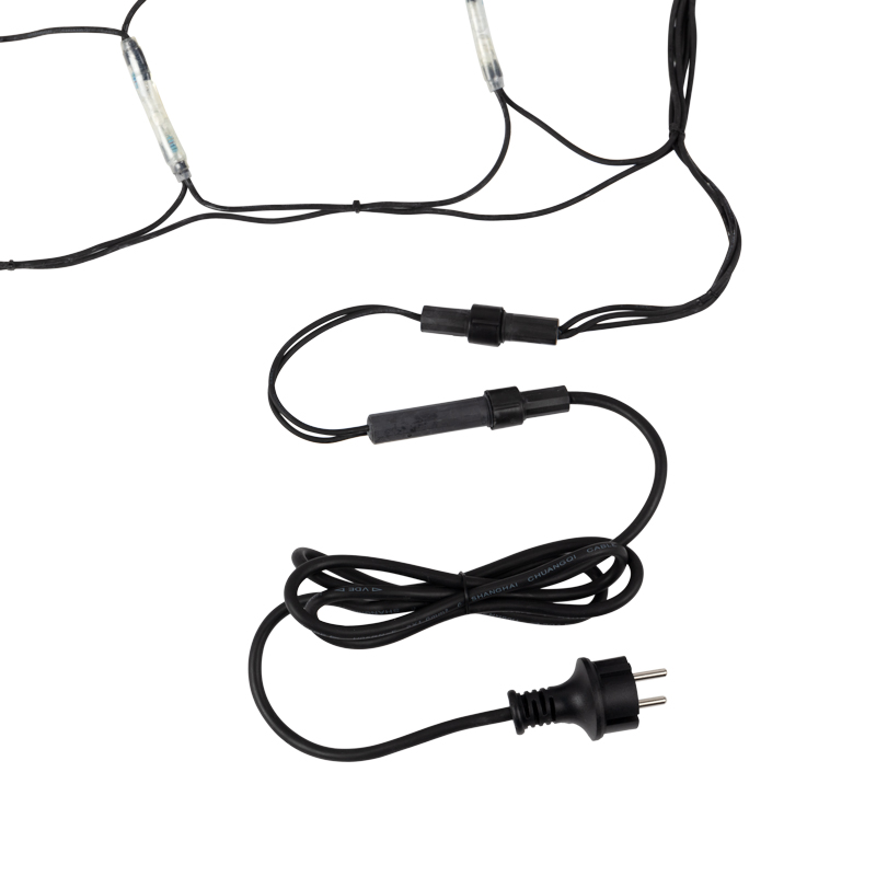 Гирлянда подключается напрямую в розетку — в комплекте есть шнур длиной 1,5 м. В одной цепи можно последовательно соединить до 20 таких сеток, что позволяет покрыть до 60 м² без распределительных коробок и удлинителей. Это особенно удобно для коммерческого оформления: улицы, торговые центры, кафе, рестораны, офисные здания. Одна точка подключения — и десятки метров яркого света. Монтаж можно выполнять с помощью пластиковых стяжек, крючков, клипс и других стандартных крепежей.