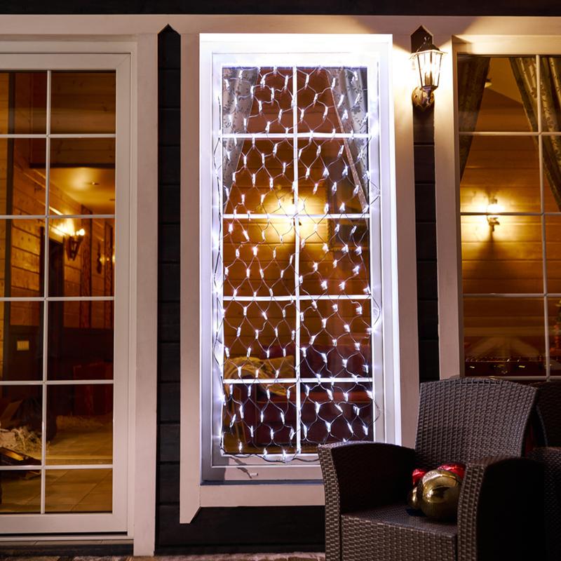 Уличная гирлянда-сетка 2×0,7 м с белым свечением и динамическими эффектами. 176 LED, чёрный провод, IP65. Для фасадов, заборов, деревьев. Питание от сети 230 В, 1,5 м шнур, соединение до 10 гирлянд. Идеальна для мероприятий и городской подсветки.