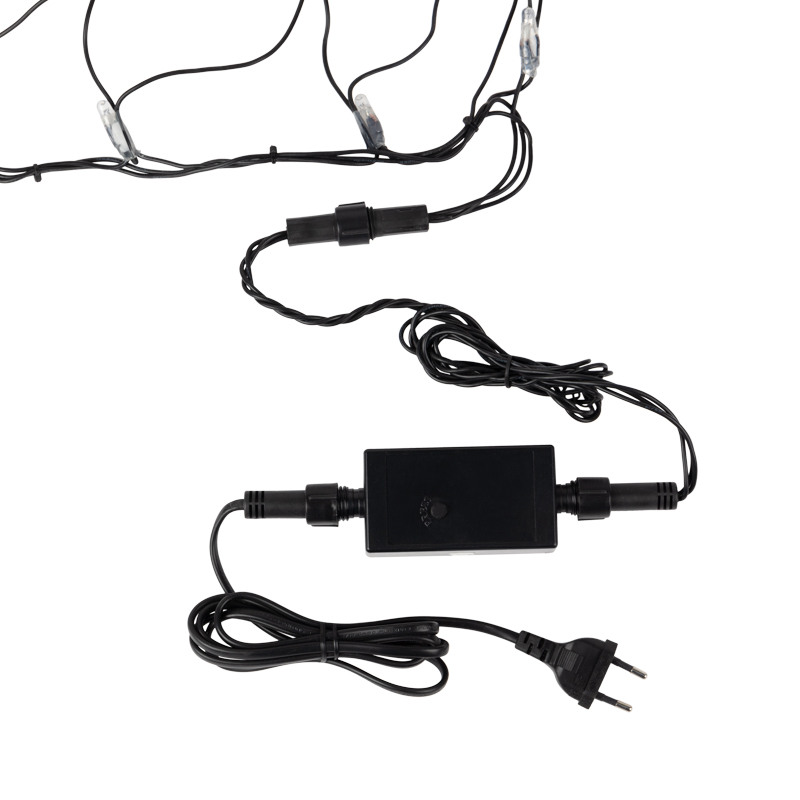 Гирлянда питается от сети 230 В. В комплекте предусмотрен шнур длиной 1,5 м с подключением, что позволяет сразу начать монтаж без дополнительных аксессуаров. Можно соединять до 10 сеток в одну линию — это до 20 м светового оформления без необходимости в дополнительной розетке.
