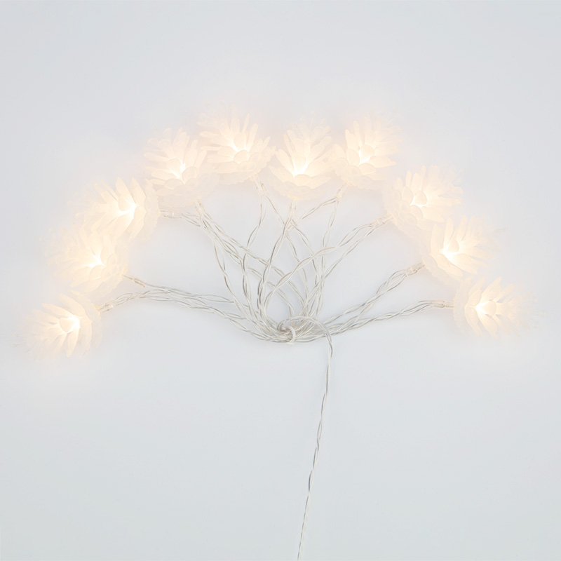 Каждый LED-элемент спрятан в корпусе декоративной шишки, что создаёт эффект мягкого, спокойного свечения. Свет получается объёмным и тёплым, а сама гирлянда выглядит как элемент природного декора с подсветкой.