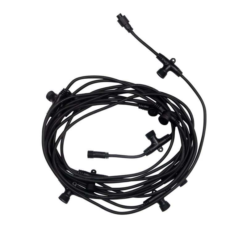 Такие гирлянды устанавливают на открытых уличных объектах. Степень влагозащиты IP65 и низкое рабочее напряжение 24 В делают их безопасными для монтажа на: