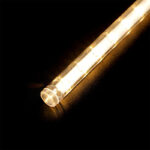 Тёплый свет особенно актуален для помещений: он не режет глаза, а создаёт мягкую, уютную атмосферу. Благодаря чёрному проводу гирлянда визуально «прячется» на фоне ели или тёмной стены, выделяя только световые потоки.