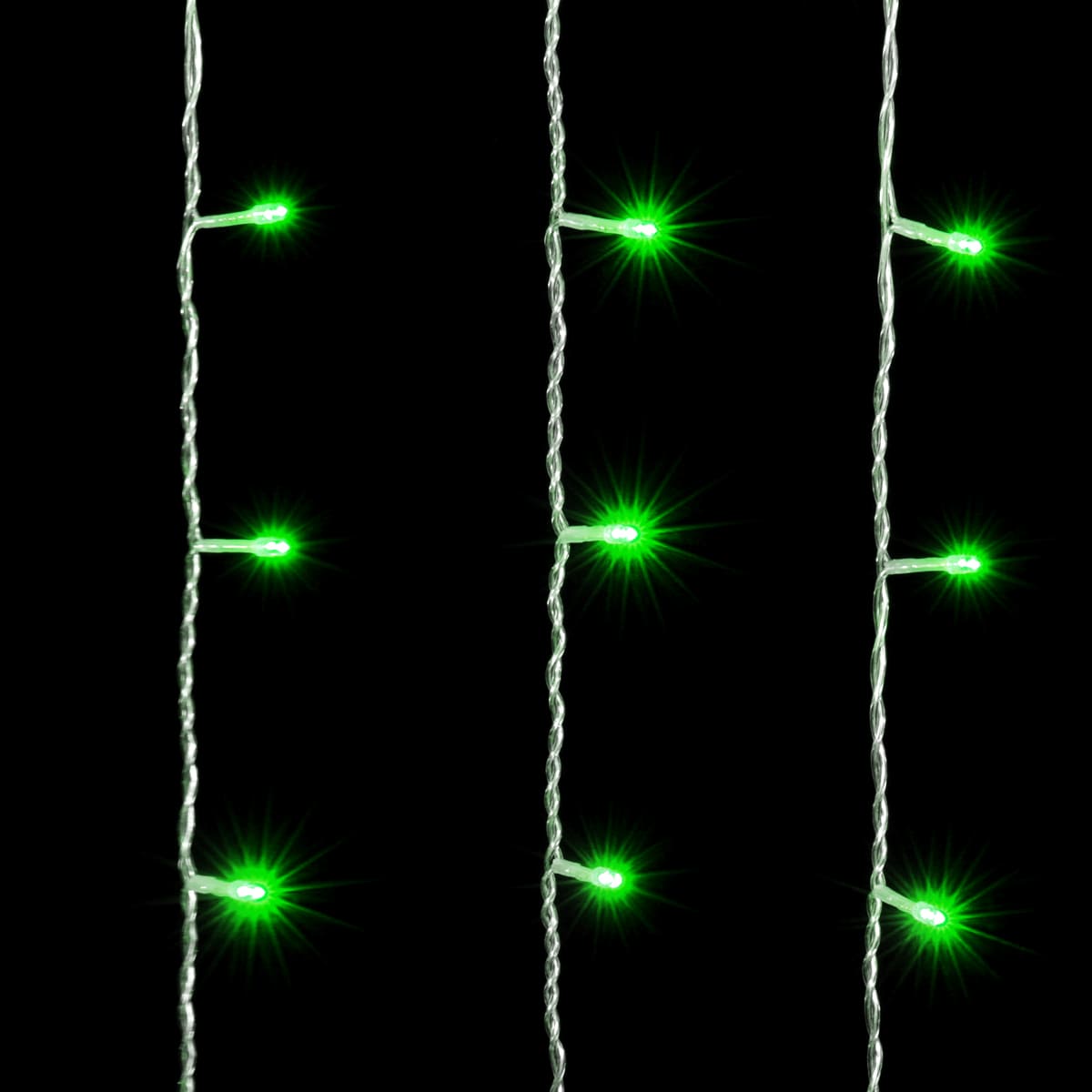 Гирлянда-занавес 1×6 м с зелёным свечением и 600 LED. Прочный прозрачный ПВХ-провод, IP54, срок службы до 15 000 часов. Для фасадов, заборов и колонн в Москве и МО.