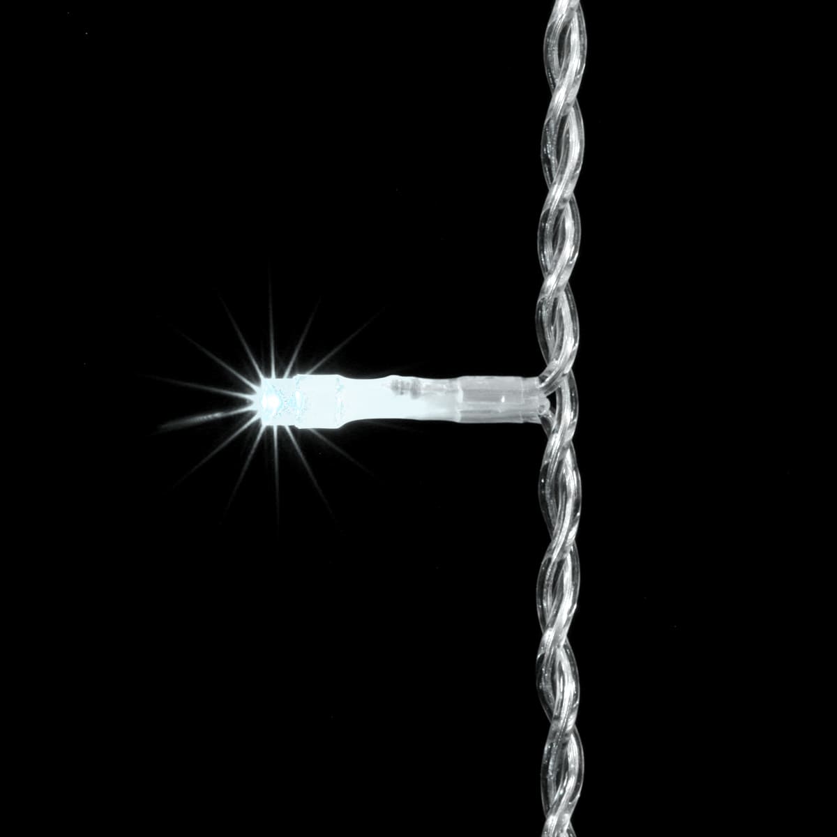 Белая гирлянда-занавес 1×9 м с 900 LED на прозрачном кабеле. Чистое статичное свечение, IP54, для фасадов, колонн и заборов. Соединяется до 10 секций.