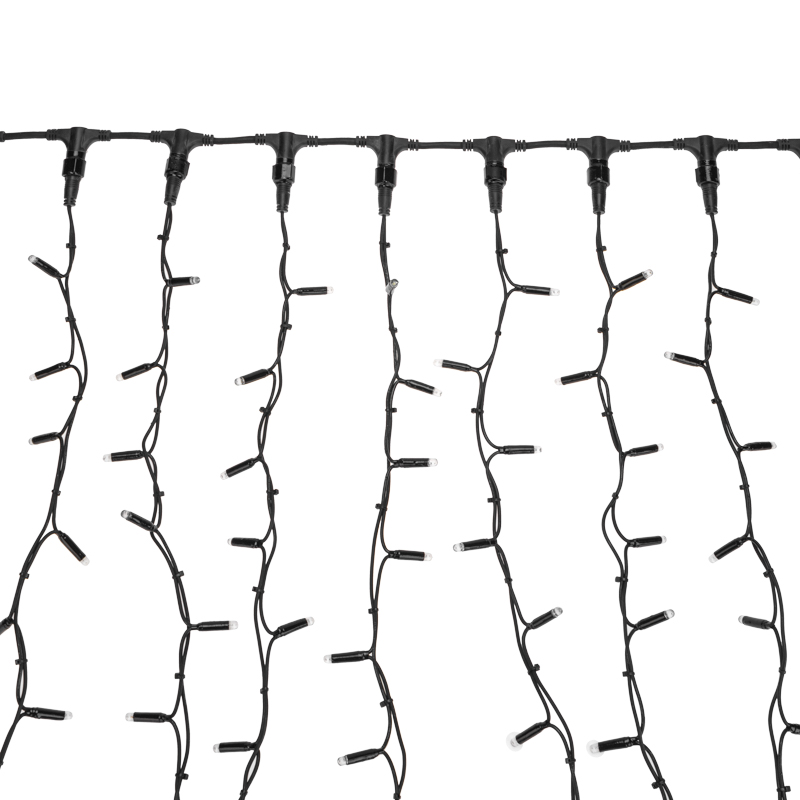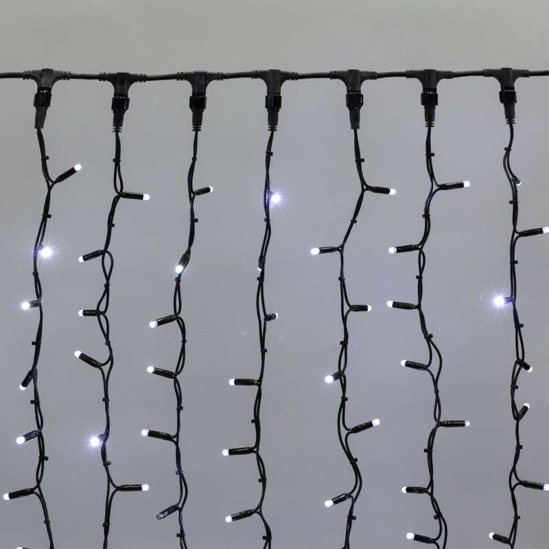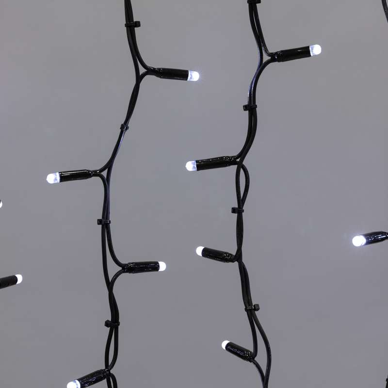 Профессиональная гирлянда-занавес 2×1,5 м с белым статичным светом и чёрным каучуковым кабелем. 360 LED, IP67, морозостойкость до –50 °C. Идеальна для фасадов, деревьев и уличных конструкций.