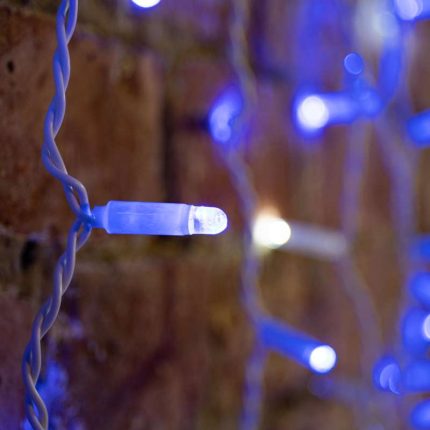 Синий цвет ассоциируется со свежестью, зимним небом и льдом. Он гармонично сочетается с белым и холодно-белым светом, а в комбинации с тёплым белым создаёт выразительные контрасты. Эффект мерцания делает композицию более динамичной и привлекает внимание даже издалека.