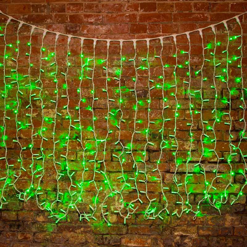 Профессиональная гирлянда-занавес 2×1,5 м с глубоким зелёным светом. 360 LED, морозостойкий белый каучуковый кабель, IP67. Подходит для фасадов, деревьев, витрин и праздничных композиций.