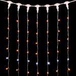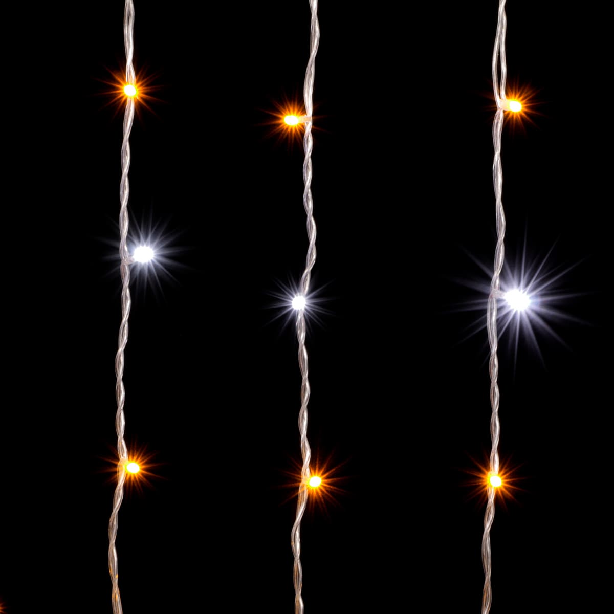 Уличная гирлянда-занавес 2×2 м, 400 LED жёлтого света с эффектом белого мерцания. Прозрачный ПВХ-кабель, защита IP54, подключение до 10 изделий в одну линию.