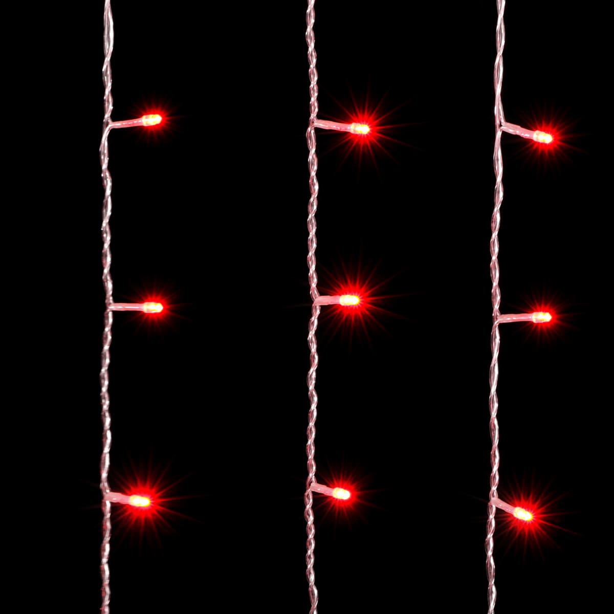 Яркая гирлянда-занавес 2×3 м с красным свечением и 600 LED на прозрачном ПВХ-кабеле. Защита IP54, морозостойкость до –30°C, подходит для фасадов, заборов, колонн и праздничного декора.