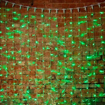 Профессиональная гирлянда-занавес 2×3 м с насыщенным зелёным свечением. 448 LED, IP65, морозостойкость до –25 °C, подходит для фасадов, деревьев и уличных конструкций.