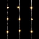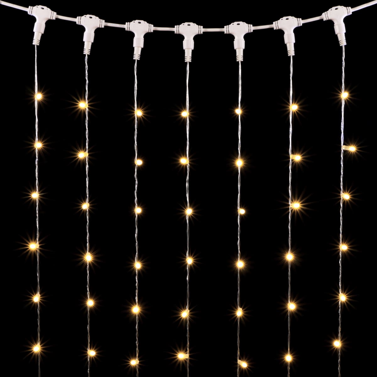 Гирлянда-занавес с колпачками 1×6 м, 600 LED тёплого белого света, прозрачный ПВХ, IP65. Подходит для уличного оформления фасадов, заборов, колонн и праздничных площадок.