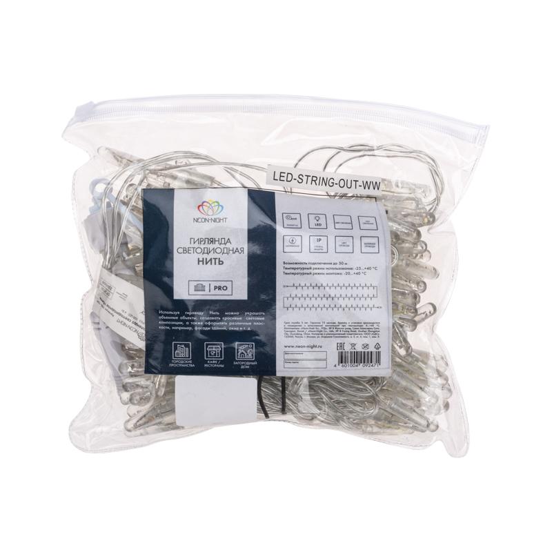 В основе гирлянды — прочный прозрачный ПВХ-провод, который практически незаметен на светлых фасадах, перилах и декоративных конструкциях. Такая конструкция делает свет основным визуальным элементом, не отвлекая на технические детали.