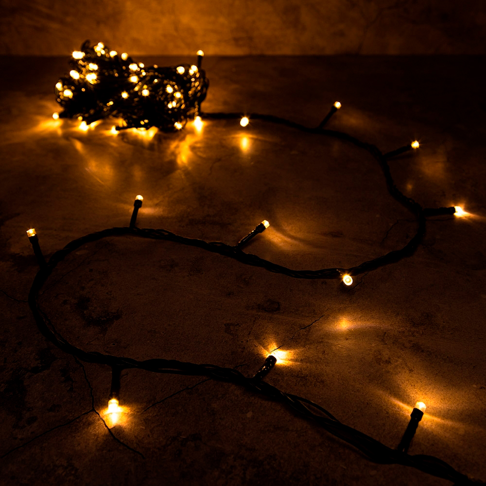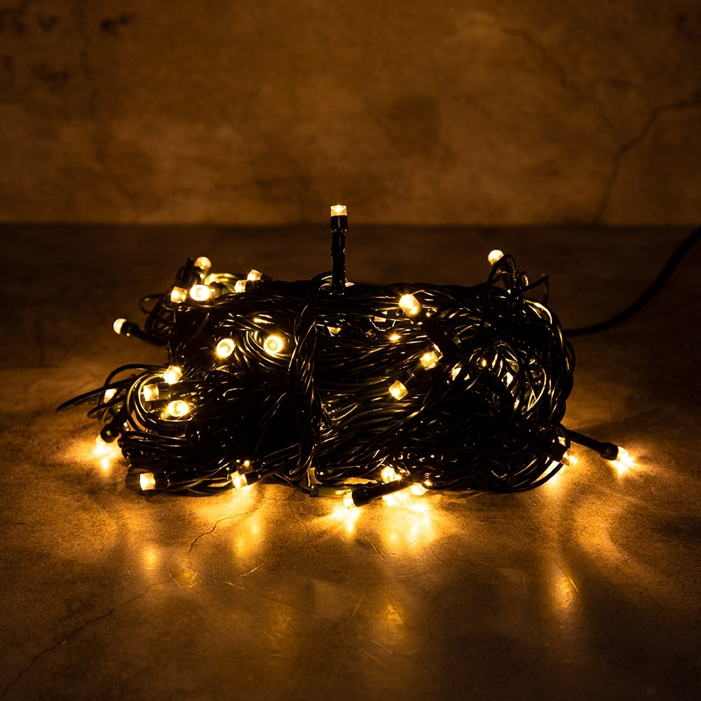Классическая интерьерная гирлянда длиной 15 метров с тёплым белым свечением и лёгким мерцанием. Отличный выбор для оформления комнат, окон, лестниц, ёлок и других элементов декора внутри помещения.