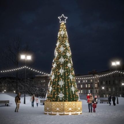 Даже при высоте 30 м ель сохраняет аккуратные пропорции и равномерность. Белая поверхность отражает свет гирлянд, придавая ей сияние и воздушность.