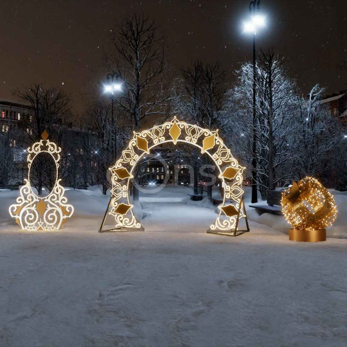 Готовый комплект для праздничного оформления городских улиц, парков и площадей. Включает световую арку, две уличные фотозоны и декоративный подарок. Объёмные 3D-фигуры из алюминия, холодостойкие, с IP65. Яркое свечение, устойчивость к морозам и осадкам, монтаж под ключ от JOYLED. Отличный выбор для городов и ТЦ.