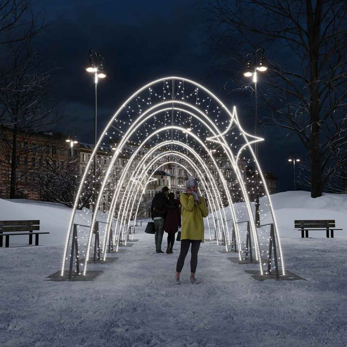 Большие световые тоннели известны своими впечатляющими размерами и утонченным дизайном. Их активно используют для оформления городских ландшафтов, центральных улиц, площадей, а также парков культуры и отдыха. Конструкция этих тоннелей представляет собой разборную систему, основанную на прочном алюминиевом каркасе. Гирлянды профессионального класса имеют низкое потребление энергии и работают на безопасном напряжении 24 вольта. Уровень защиты IP65 и резиновый кабель исключают проникновение пыли и влаги, а также обеспечивают устойчивость к сильным морозам и плохим погодным условиям. Светодиодная 3D инсталляция создает уникальную возможность войти внутрь и насладиться сказочной атмосферой под ярким высоким потолком, даря незабываемые эмоции и оставляя превосходные воспоминания о сделанных фотографиях.