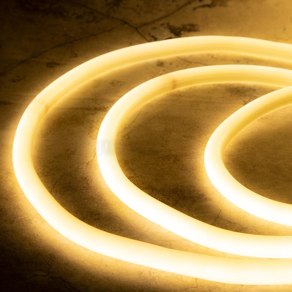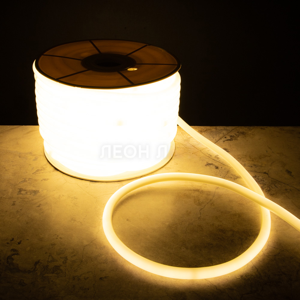 Этот тип неона отличается круглым сечением, равномерным свечением на 360° и повышенной гибкостью, благодаря чему легко монтируется вдоль любых изгибов — колонн, арок, перил, деревьев. Тёплый белый свет создаёт атмосферу уюта и комфорта, а высокая степень защиты IP65 гарантирует надёжную работу на улице даже при температуре -40 °C.
