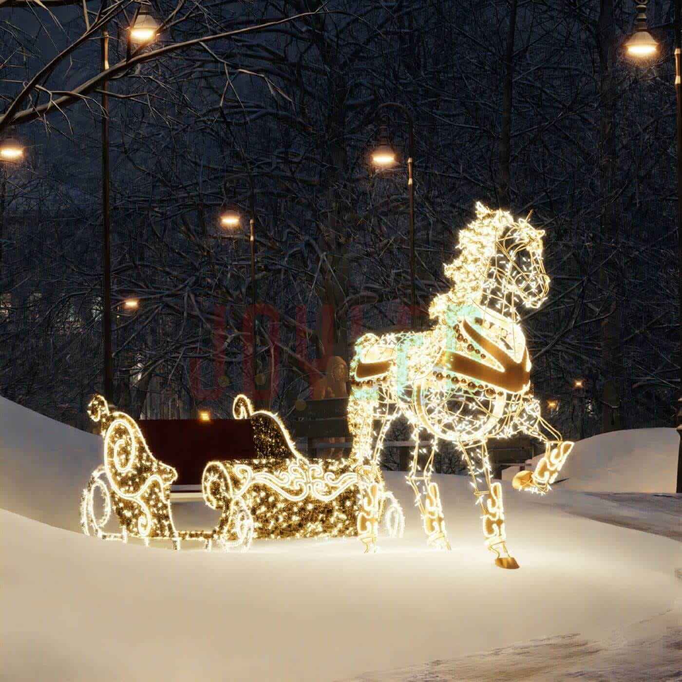 Световой комплект «Лошадь с санями» — это масштабная 3D-инсталляция, которая сразу задаёт атмосферу праздника. Она станет визуальным центром оформления улицы, торговой площади, сквера, входной группы ТРЦ, бизнес-центра или городской аллеи. Композиция включает две фигуры: изящную лошадь с проработанными формами и эффектными линиями и просторные сани, в которых можно посидеть или сделать фото.