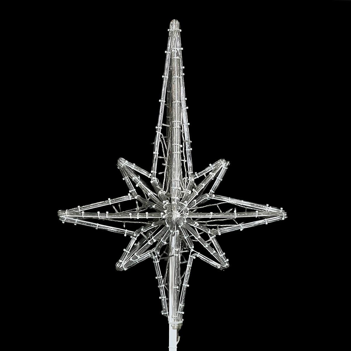 Световая макушка в форме «Розы Ветров» — эффектное украшение для городской или частной ёлки. Высота 1 м, цвет свечения — белый (или любой на выбор), каркас из прочного металла, защита IP65. Подходит для уличной эксплуатации в любую погоду. Надёжный акцент для новогоднего оформления в ТЦ, парках, скверах и жилых кварталах.
