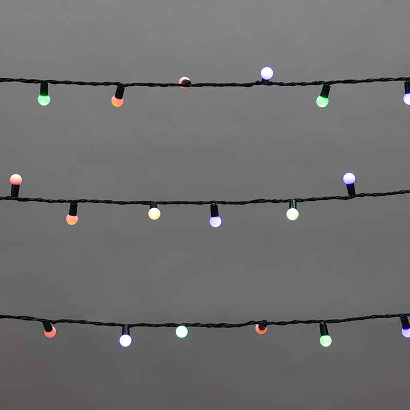 Универсальная гирлянда с маленькими RGB-шариками диаметром 15 мм. Цвет динамически меняется в 8 режимах. Лёгкая и гибкая — отлично ложится на крону дерева, изгибы ограждений, перил и малых архитектурных форм.