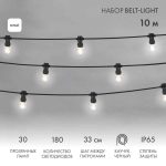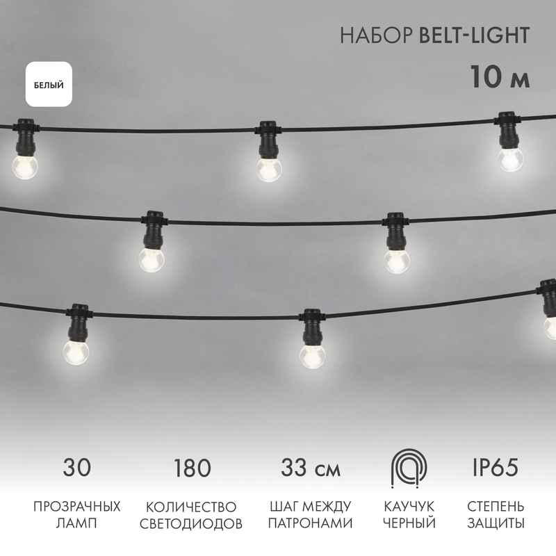 Набор Белт-Лайт JOYLED — профессиональная гирлянда длиной 10 м с 30 белыми лампами E27 и прочным каучуковым проводом IP65. Создаёт чистое яркое свечение для оформления фасадов, террас и деревьев. Полностью защищена от пыли и влаги, работает при –25…+40 °C. Готовое решение для уличного освещения в современном стиле.