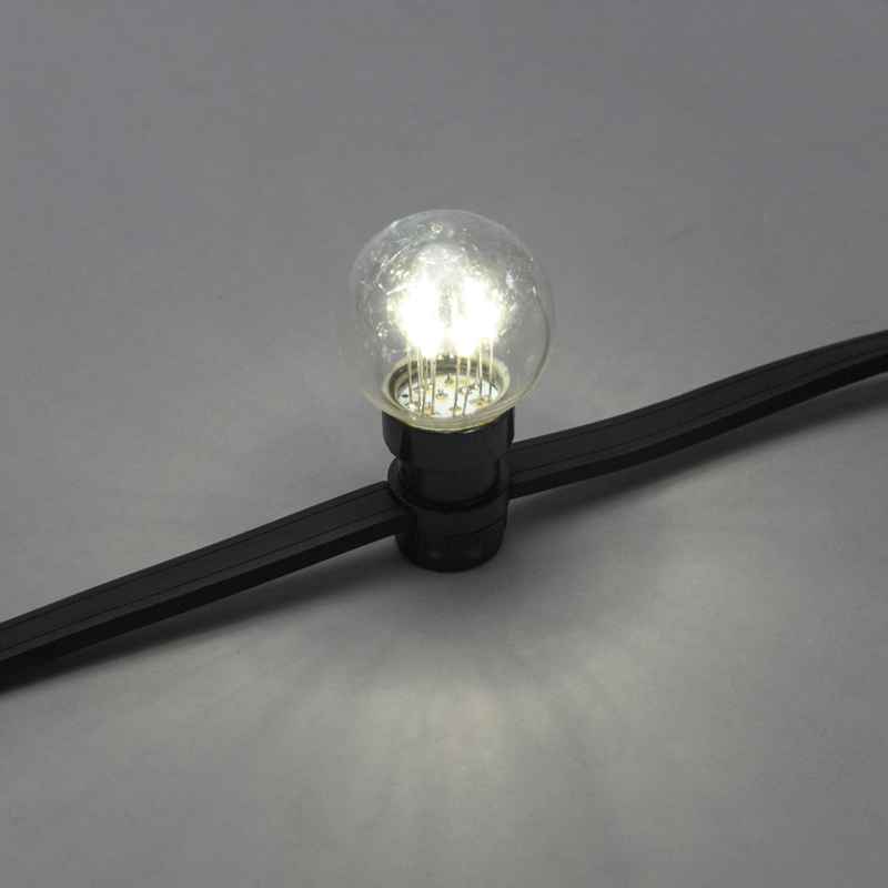 Провод изготовлен из каучука — материала, который используется в профессиональном наружном освещении. Он не боится мороза, не трескается и не потеряет эластичность даже при –25 °C. Чёрный провод гармонично смотрится на фасадах и деревьях, подчёркивая глубину света. Каждый патрон E27 герметично закрыт и надёжно защищён от влаги и пыли, что исключает короткое замыкание и повреждение контактов.