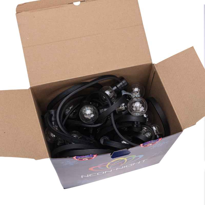 Провод выполнен из каучука — материала, который не трещит на морозе и не высыхает на солнце. Он надёжно защищает внутренние жилы и сохраняет эластичность даже при низких температурах. Чёрный цвет делает кабель незаметным на тёмных фасадах и деревьях. Каждый патрон E27 герметичен и полностью защищён от влаги и пыли, что исключает короткие замыкания и обеспечивает долговечность гирлянды.