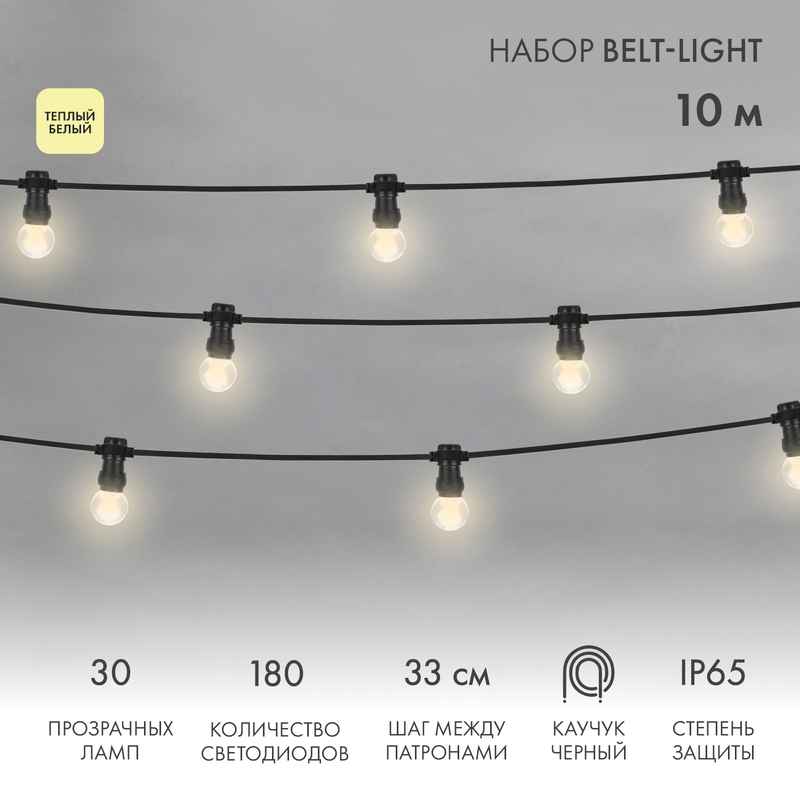Набор Белт-Лайт 10 м, провод чёрный каучук, шаг 33 см, 30 тепло-белых патронов, IP65