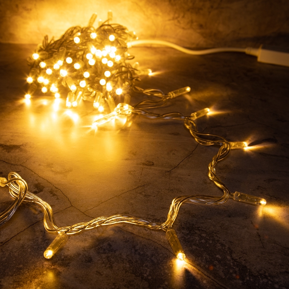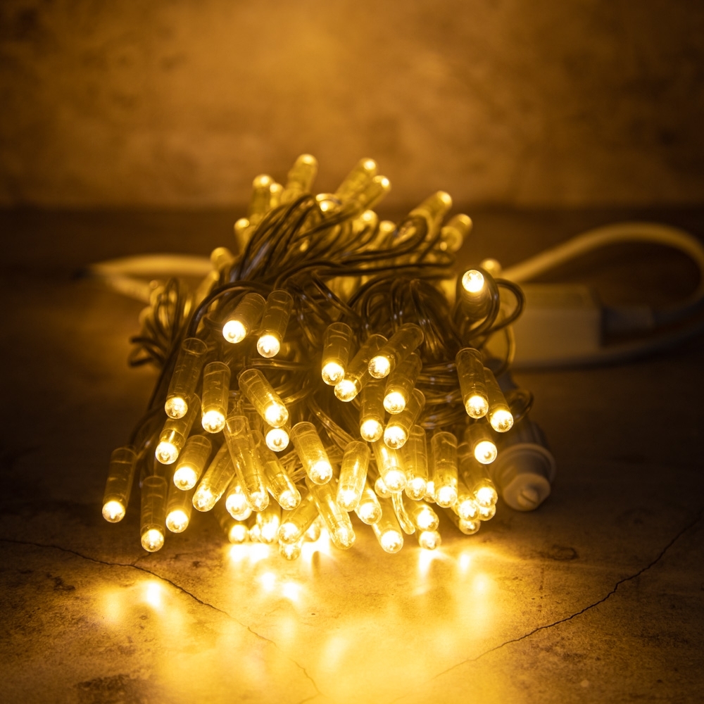 Эта гирлянда длиной 10 метров — оптимальный выбор для тех, кто ищет надёжную и универсальную подсветку без лишних эффектов. Тёплое белое свечение создаёт мягкую, уютную атмосферу — именно ту, что ассоциируется с домом, праздником и спокойствием.