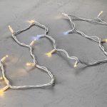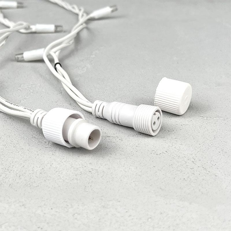 IP65 гарантирует стабильную работу под открытым небом. Белый цвет провода делает гирлянду практически незаметной на светлом фасаде.
