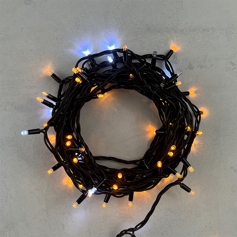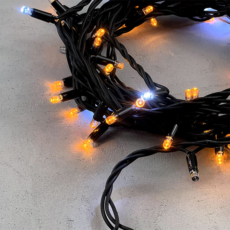 Яркая гирлянда с жёлтым свечением и эффектом белого мерцания. Прочная, влагозащищённая (IP65), на надёжном чёрном каучуке. Подходит для улицы: фасады, деревья, перила. Работает от сети, соединяется в цепь до 10 шт.