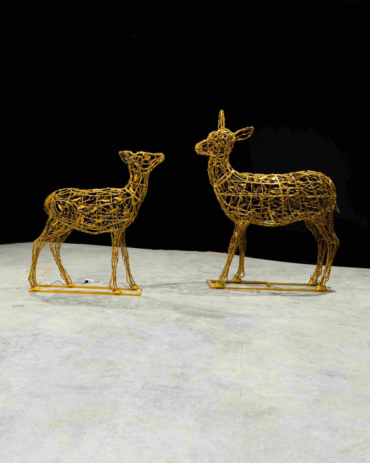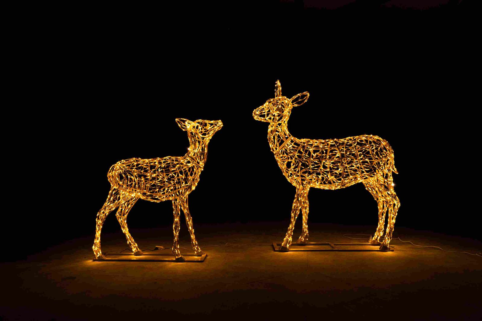 Эффектный дуэт световых фигур для уличного оформления: олениха и оленёнок. Высота — 2,83 и 2,11 м соответственно. Подходят для украшения парков, входных групп, ТЦ и городских пространств. Прочный алюминиевый каркас, теплое свечение, защита IP65. Поставляются с плитками пригруза и готовыми комплектами подключения.